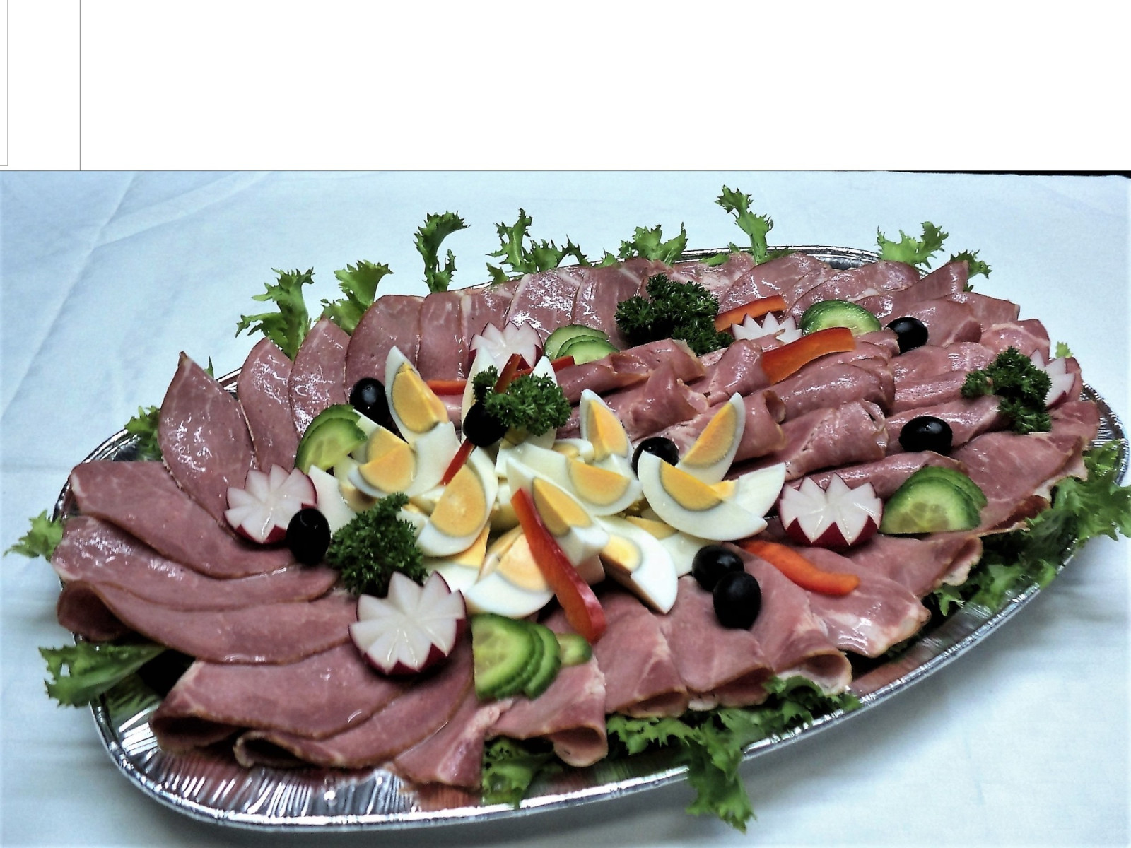 Házi bükkfán füstölt pácolt tarja tál tartalmaz személyenként : 15 dkg választott saláta alapot ,15 dkg házi bükkfán füstölt pácolt tarját, 2db főtt tojást,1 db fűszervaj rózsát, paradicsomot, kígyóuborkát,  díszítést.