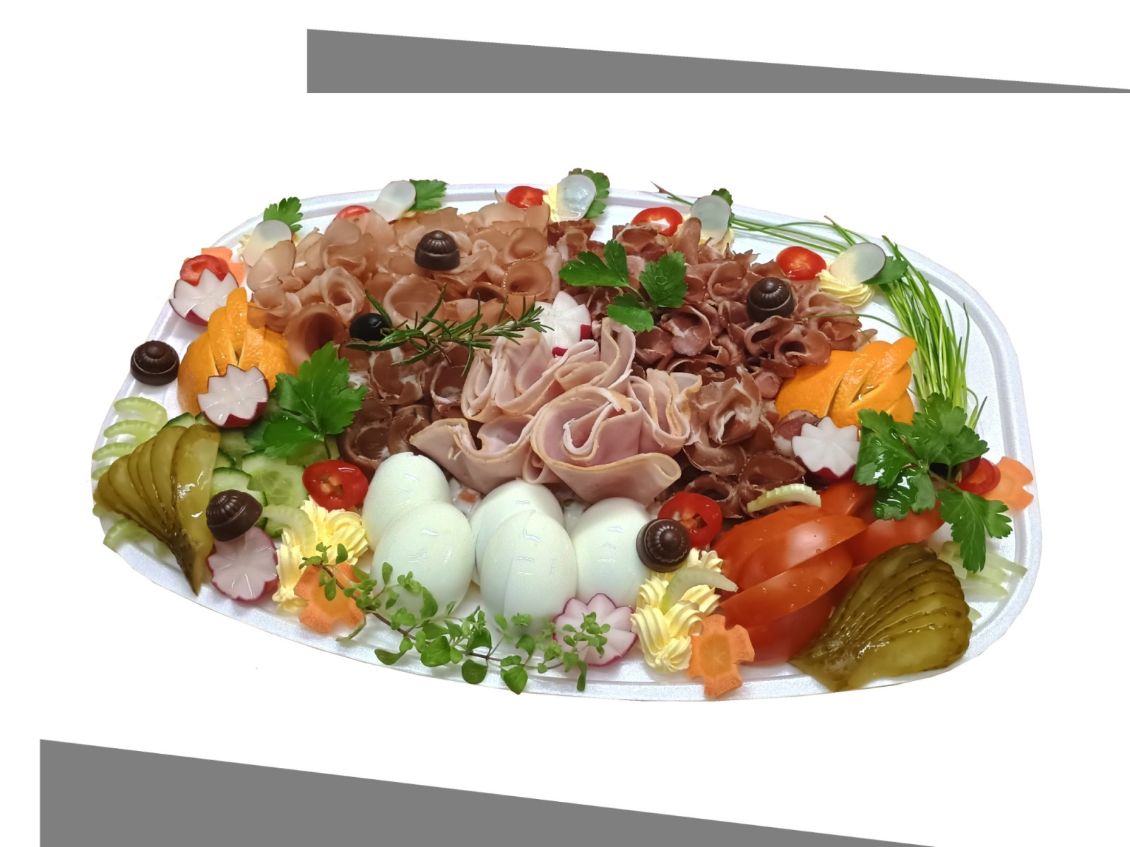 Termékleírás: Személyenként 15 dkg salátaalapon, 5 szelet pápai gépsonka, 15 szelet fekete erdő sonka, 15 szelet füstölt magyar parasztsonka, 2 db főtt tojás , tormakrém és idényzöldség díszítés.
