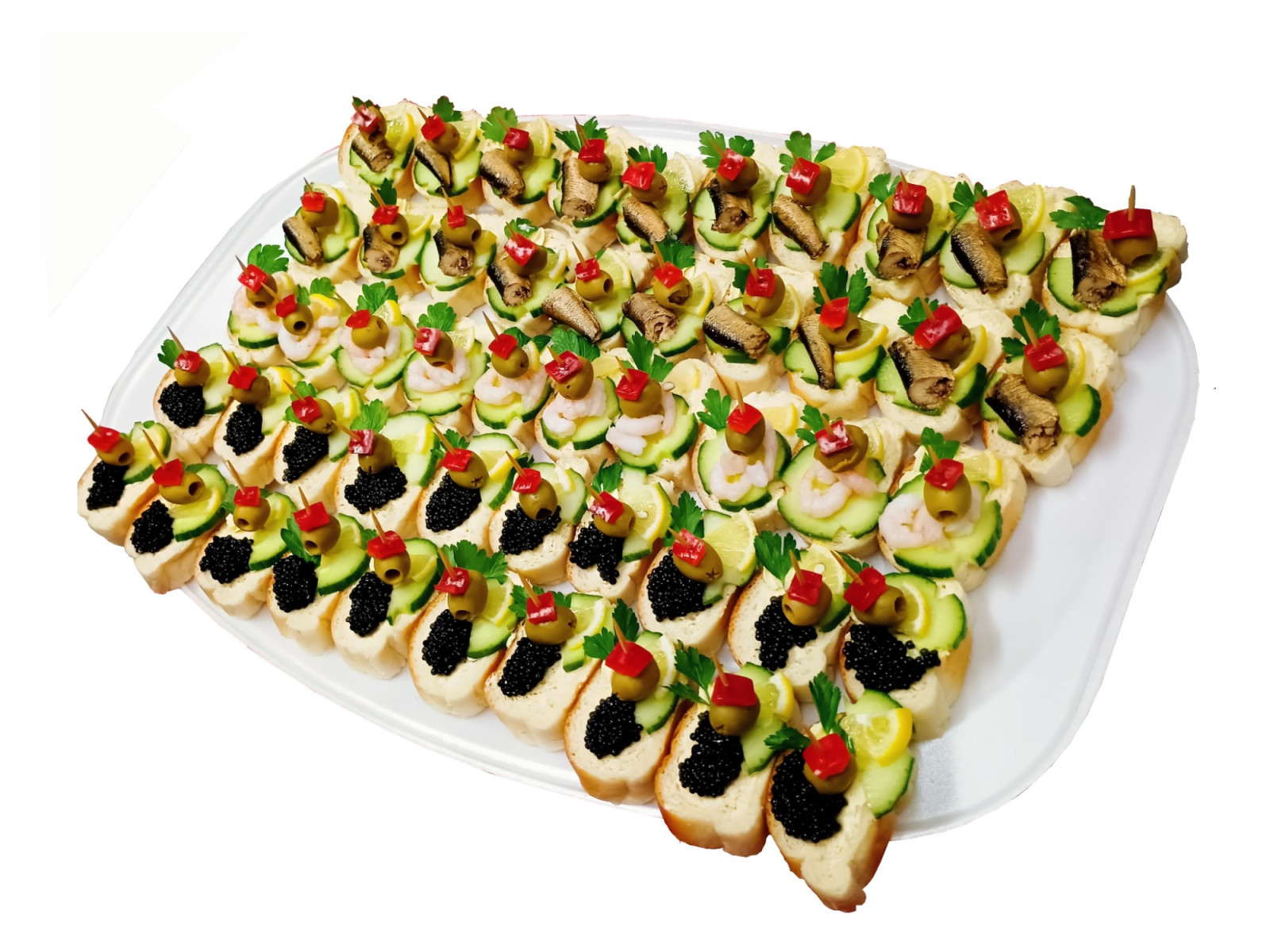 Mini bagett kaviár,rák.sprotni szendvics tál 3 fajta ízből áll: Kaviár,rák,sprotni.