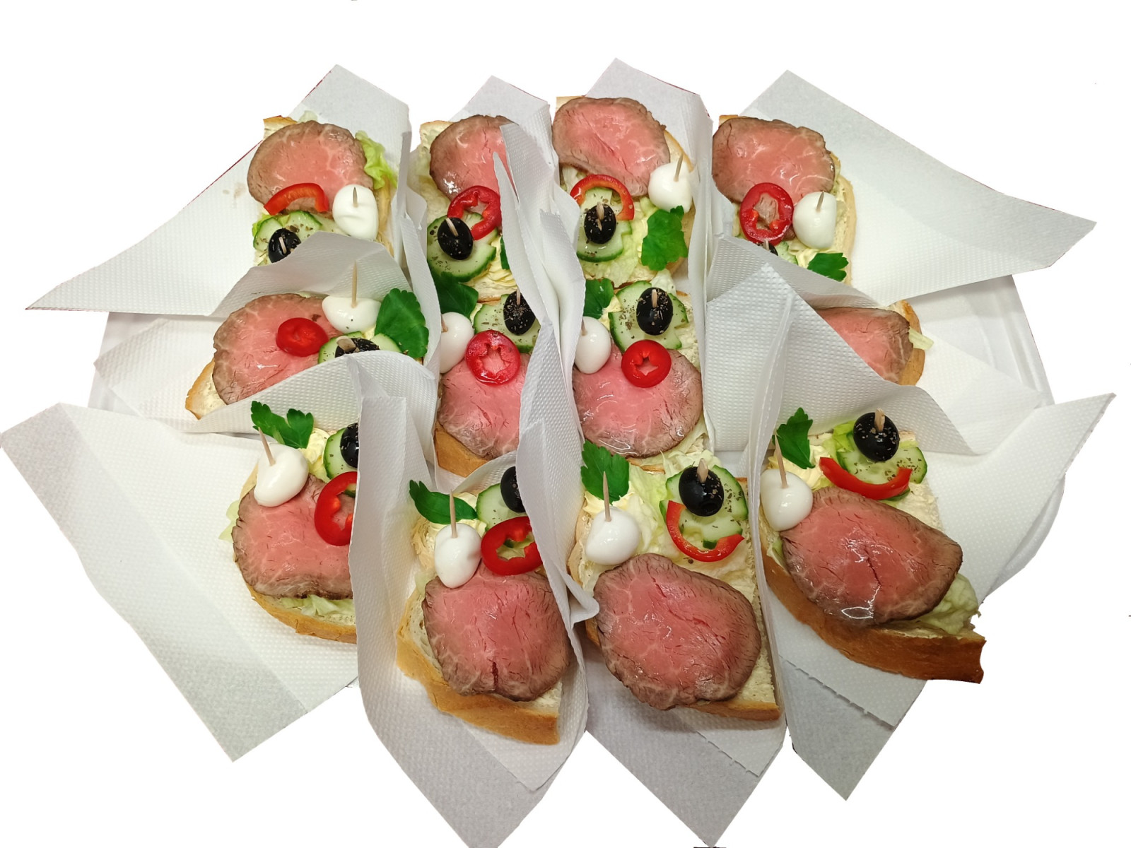 Termékleírás: A tálon személyenként 3 db szendvics Argentin rose bélszínel tormakrémmel,Mazzarella golyóval, uborkával ,kápia paprikával,olajbogyóval,petrezselyem zöldell díszítjük.